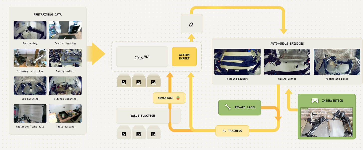 The flip side of the coin is that the progress curve of these models is incredible. Physical Intelligence’s π*0.6 has shown what’s possible when you combine imitation and reinforcement learning: their RECAP framework trains robots with demonstrations, first, then corrections from human operators and then lets the robot practice on its own.